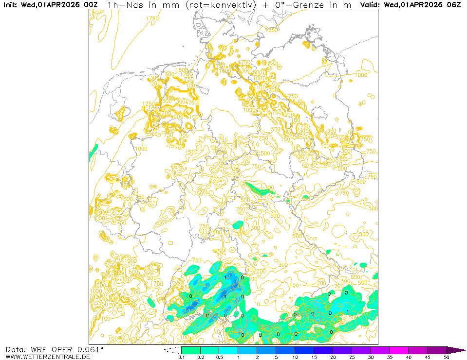 WRF (Weather Research and Forecasting model) ist ein frei verfügbares Wettervorhersagemodell welches auf der Wetterzentrale 4 mal täglich bis 72 Stunden in die Zukunft gerechnet wird. Es wird z.Z. auf einem Gitter von 5 km gerechnet und deckt Mitteleuropa ab.